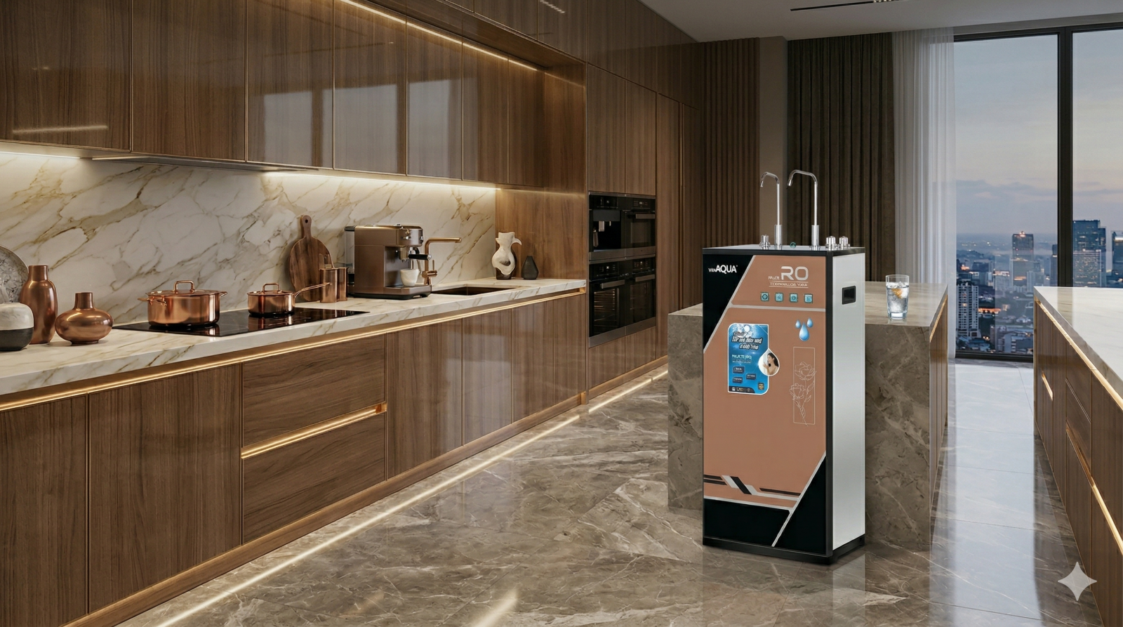 Dòng model VinAQUA V3B gây ấn tượng với thiết kế tủ đứng vững chãi, phối màu nâu đồng và đen tinh tế. Mặt kính cường lực không chỉ giúp sản phẩm sáng bóng, dễ vệ sinh mà còn tôn lên vẻ sang trọng cho không gian phòng khách hoặc bếp của bạn.